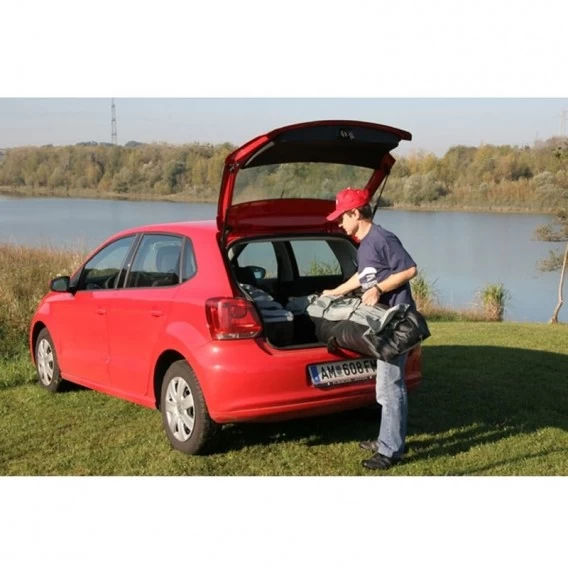 Der gesamte Katamaran kann für Transport und Lagerung in nur 3 Taschen verpackt werden. Zwei längliche Taschen (180 x 30 x 30 cm) und ein Packsack (80 x 40 x 25 cm). Passend für viele Autos, Dachboxen und Wohnmobile.
