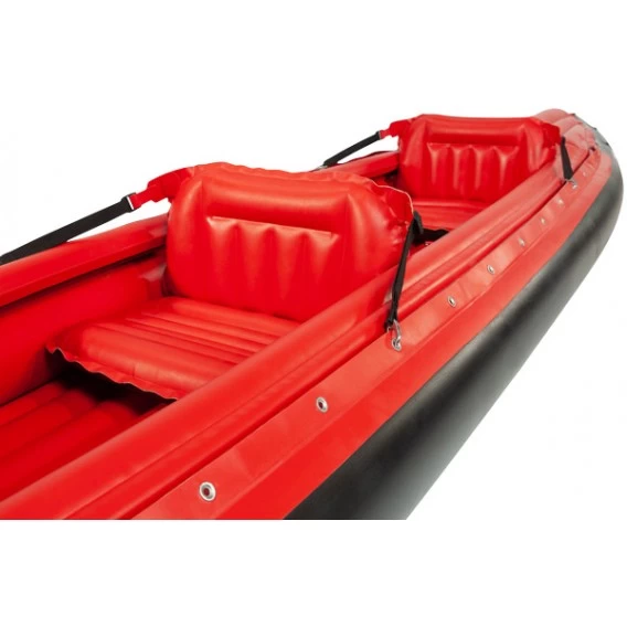 Das seitlich durchgehend aufgeblasene Verdeck bietet Schutz bei Wellengang und erhöhte Torsionsstabilität. Gestalten Sie Flexibilität nach Bedarf: Mit zwölffach verstellbaren Positionen für Ein-, oder Zweisitzer, oder um sich beim „Picknick auf See“ in die Augen zu schauen… Auch die optionale Spritzdecke kann auf der durchgehenden Ösenleiste befestigt werden. Sie wollen baden gehen? Die schrägen Seitenteile erleichtern das Einsteigen ins Boot vom Wasser aus.